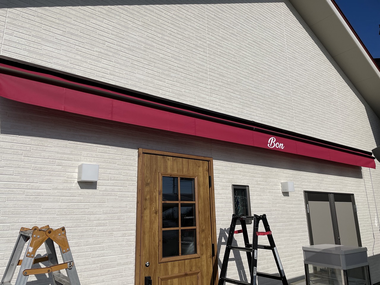 「パン工房」の文字が映える、おしゃれな巻上げ式テントです。強い日差しを遮ってパンや商品の劣化を防ぐのはもちろん、時間帯や天気に合わせてテントの出し入れが自由にできます。ハンドル一つで、お店の入り口をパッと明るくしたり、涼しい日陰を作ったりと、おもてなしの幅が広がります。