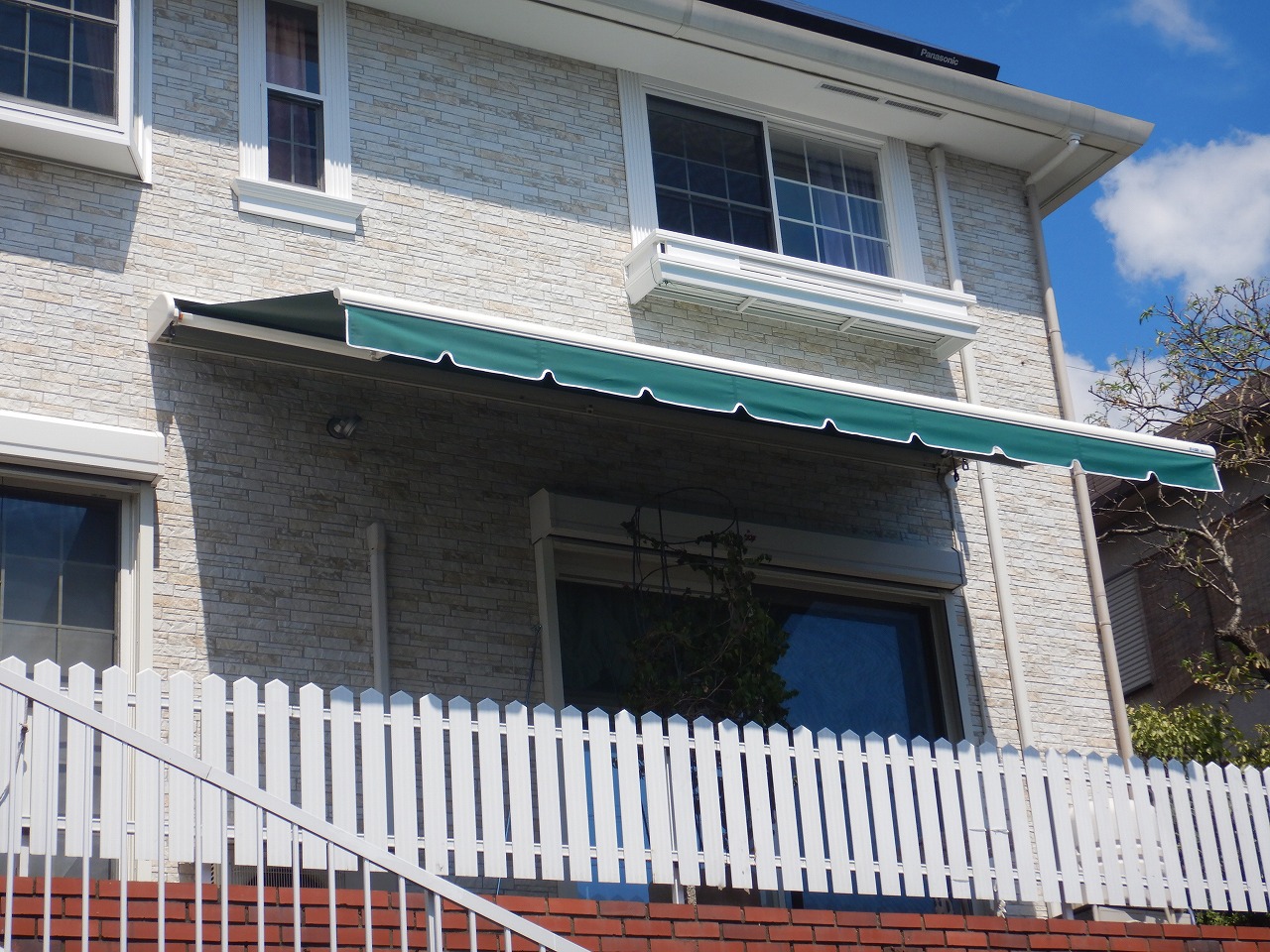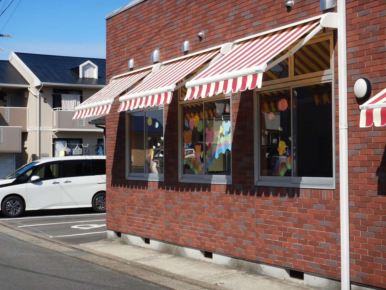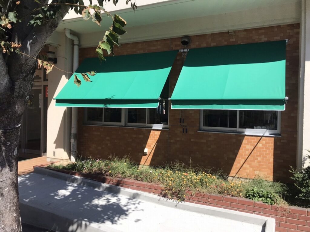 赤と白のストライプが可愛らしいオーニングテントは、保育園の雰囲気を明るく彩ります。強い日差しを和らげて室内の温度上昇を抑えるだけでなく、窓際での遊びや活動を紫外線からしっかりガード。急な雨でも窓を開けて換気ができるので、子供たちが毎日を健やかに過ごせる環境づくりをサポートします。