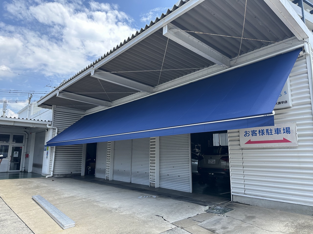 建物の軒先を大きく活用できるテントは、雨の日の作業スペース確保に最適です。柱を増やさず広い空間を覆えるため、車の出し入れもスムーズ。直射日光を遮ることで、夏場の工場内の温度上昇を抑え、スタッフの皆様が働きやすい環境をつくります。